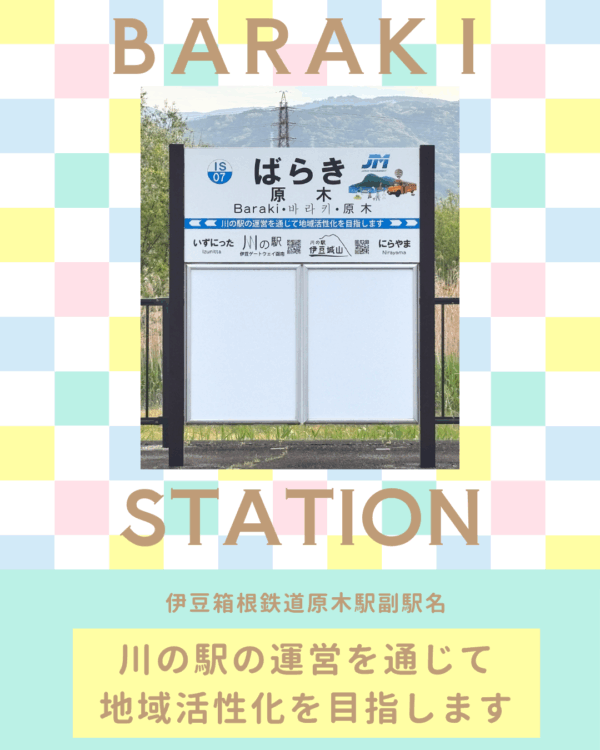 2024年に伊豆箱根鉄道株式会社と原木駅の副駅名権(ネーミングライツ)のスポンサー契約を締結し、原木駅の副駅名は、「川の駅の運営を通じて地域活性化を目指します」となっております。ぜひ皆様原木駅に足を運んでみてくださいね。