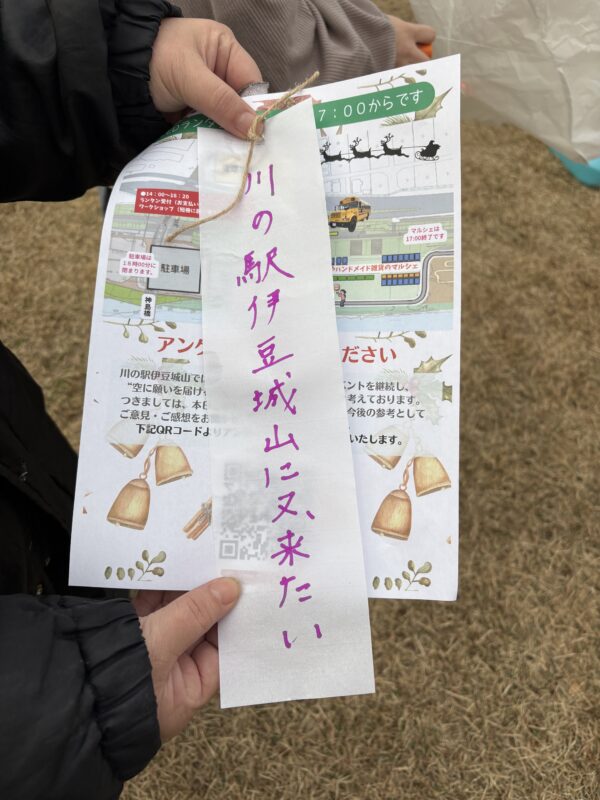 2025年月13日(土)に、 『みんなで灯そうクリスマスランタンフェスタin川の駅伊豆城山を開催しました。サンタさんに会ったり、ワークショップに参加したり、マルシェでお食事したりと、大変賑やかでした♪時折強い風が拭き、夕方に少しだけ雨も降りましたが、たくさんの方にご来場いただき、皆様本当に有難うございました!また遊びにきてくださいね♬